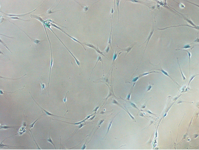 Fig. 2: Tinción de SA-β-Gal a fibroblastos humanos de piel humana. El color azul es característico de la tinción asociada a la SA-β-Gal expresada en células senescentes. Este cultivo en particular presenta una elevada cantidad de células senescentes.