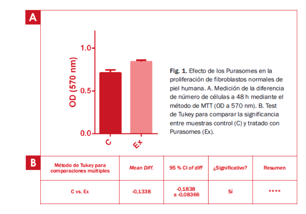Fig. 1: Efecto de los Purosomes en la proliferación de fibroblastos normales de piel humana. A, Medición de la diferencia de número de células a 48h mediante el método de MTT (OD a 570 nm). B, Test de Tukey para comparar la significancia entre muestras control (C) y tratado con Purasomes (Ex).
