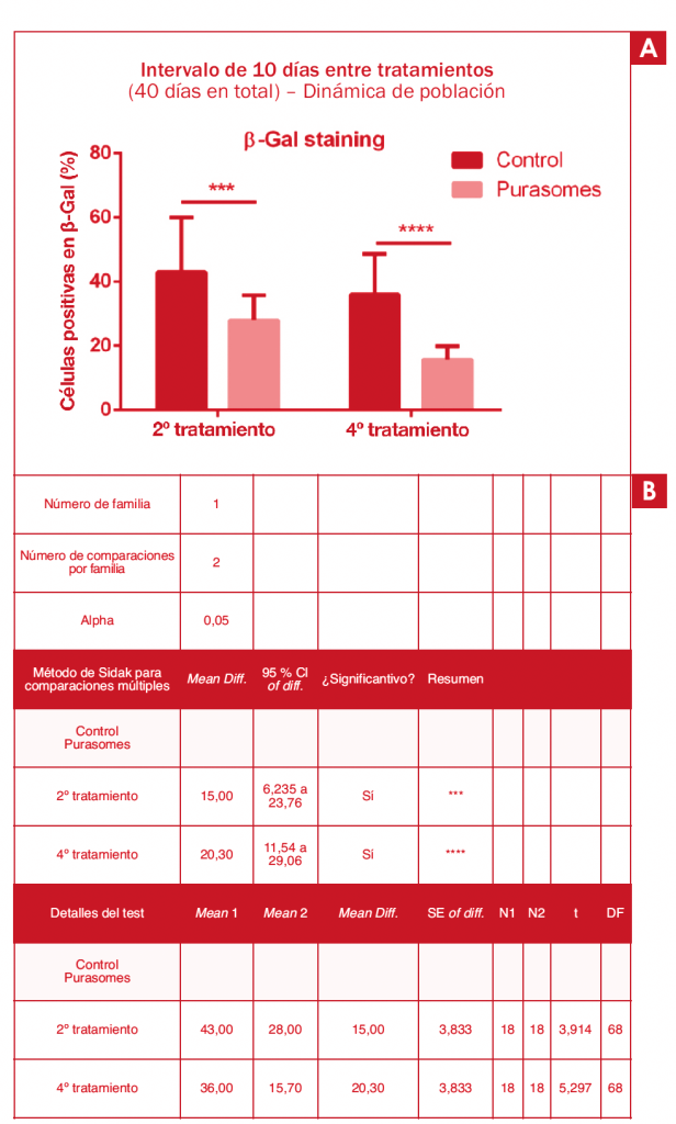 Se puede observar en la Figura 3 que el tratamiento con Purasomes disminuye significativamente el porcentaje de fibroblastos senescentes iniciales con respecto al control sin tratar (Fig. 3A, B).